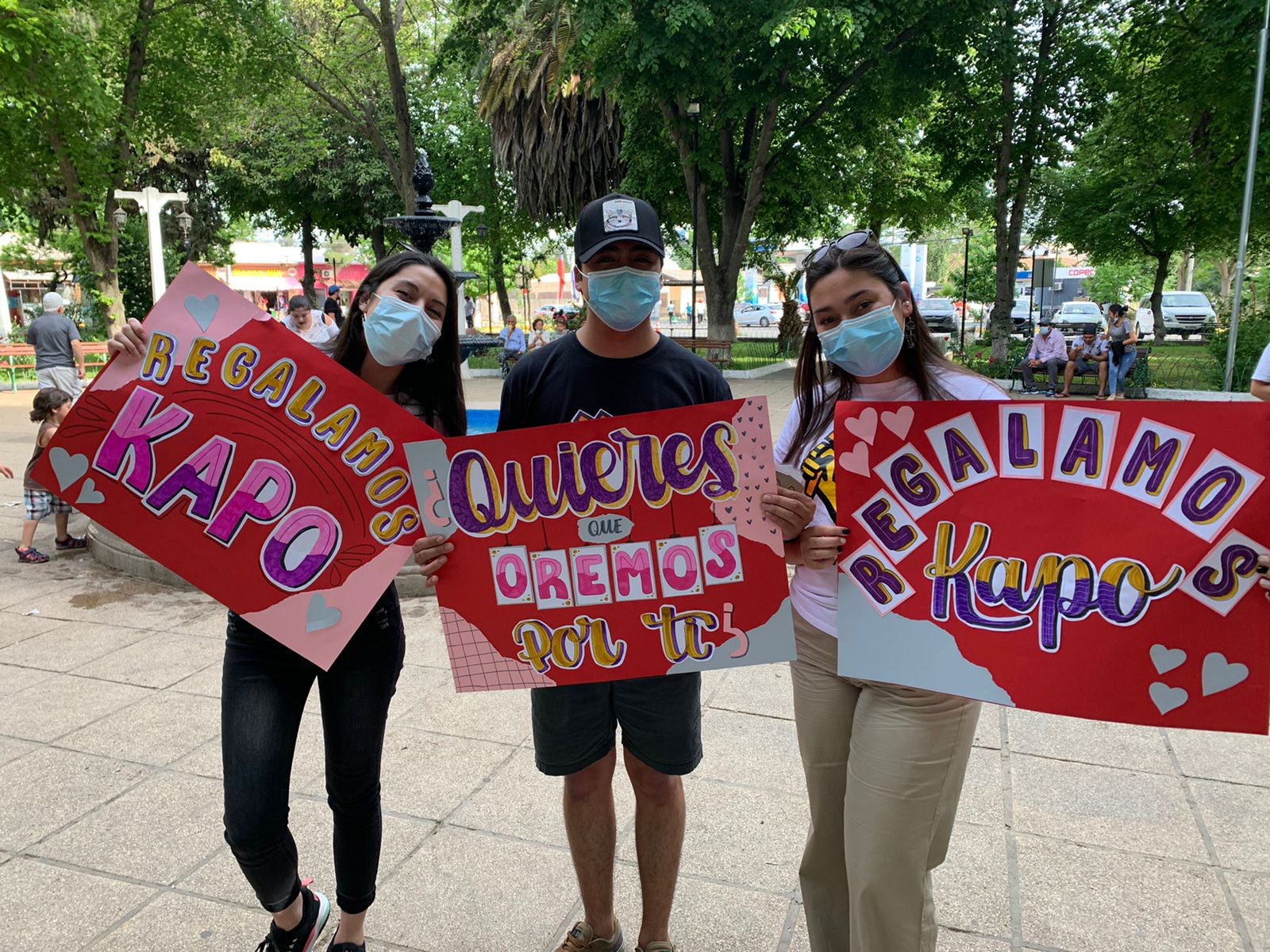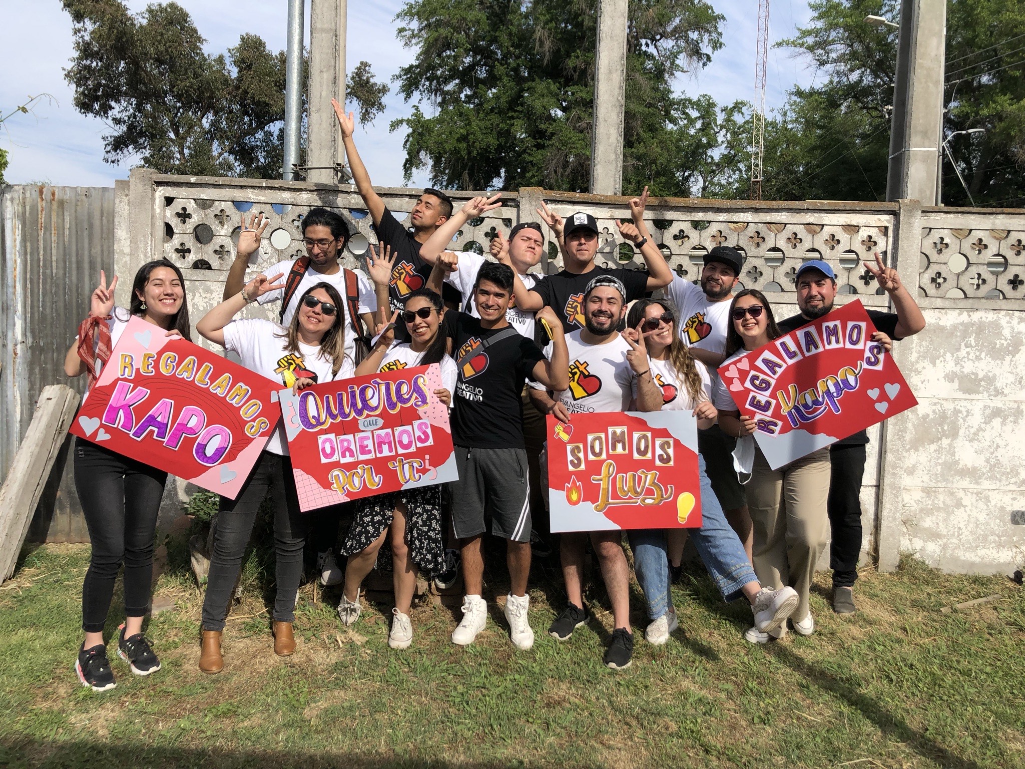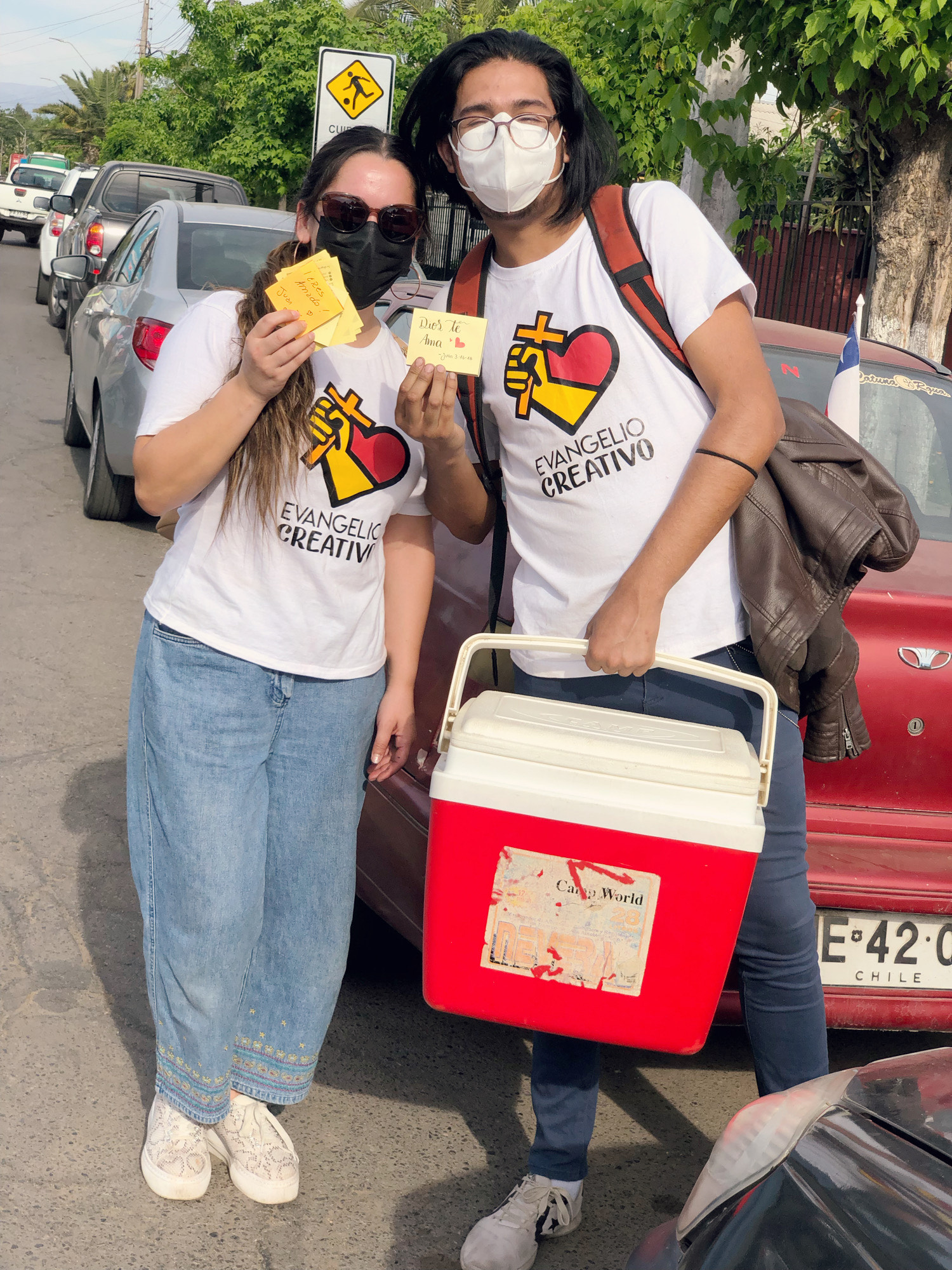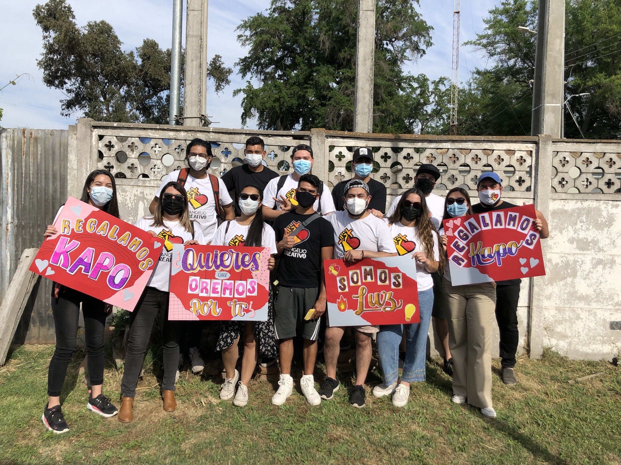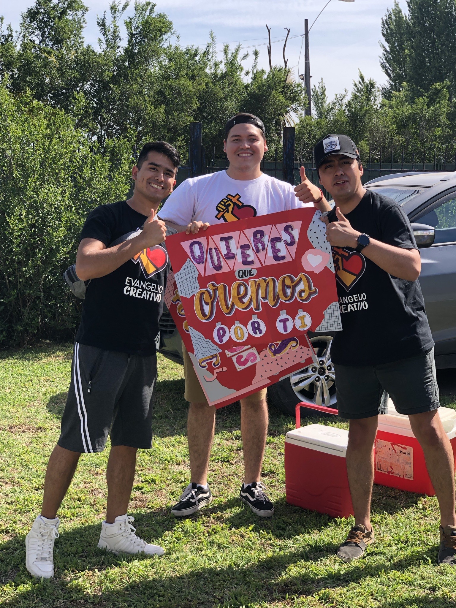 Llegamos hasta la plaza de aquella comuna con tres coolers llenos de jugos kapos. Junto con ello, llevamos nuestros parlantes y muchísimos tratados y post it. También, llevamos hermosos carteles ofreciéndonos a orar por las personas.⁣